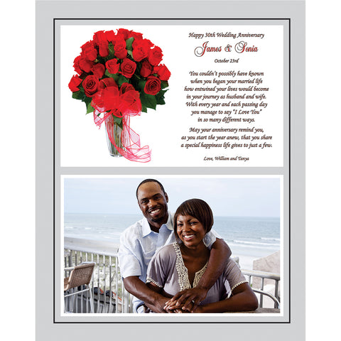 This lovely bouquet of roses design and sincere poem congratulating the anniversary couple is the perfect anniversary gift for parents, grandparents, other relatives and friends. The Poetry Gift is personalized with names, anniversary date and an optional closing phrase. This personalized print can be framed in a standard 8x10 inch picture frame after delivery. Perfect for any year anniversary.
