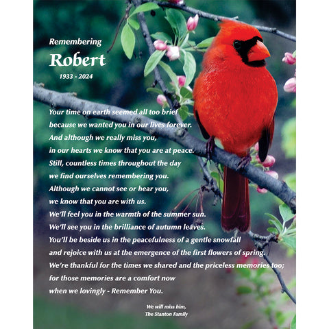 Many people feel the presence of a deceased loved one in nature - like when a cardinal is singing in a nearby tree. The cardinal in the print represents their loved one sending them a sign that they are at peace and will be with them always. Remembering You sympathy poem will bring comfort to the family of a loved one who has died. This sympathy gift will become a lasting keepsake to someone who has lost a husband, wife, father, mother, grandparent, sister, brother, daughter, son, uncle, aunt. Send to the family when a loved one dies or give as a gift for an anniversary of his or her death or birthday. Personalize the gift with name and dates. This personalized print can be framed in a standard 8x10 inch picture frame after delivery.