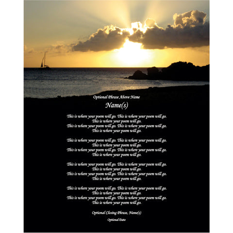 Express your unique thoughts and feelings, with our "Design Your Own Poem" option. Any verse that expresses what is in your mind and heart can be considered poetry. It need not rhyme and it need not be lengthy. Give a poem that you wrote to your friends and family as birthday presents and show them how special they are to you. They will be touched by your words and by your thoughtfulness. This personalized print can be framed in a standard 8x10 inch picture frame after delivery. With your poem and our design expertise we can help you create a one-of-a-kind personalized keepsake for your loved ones.