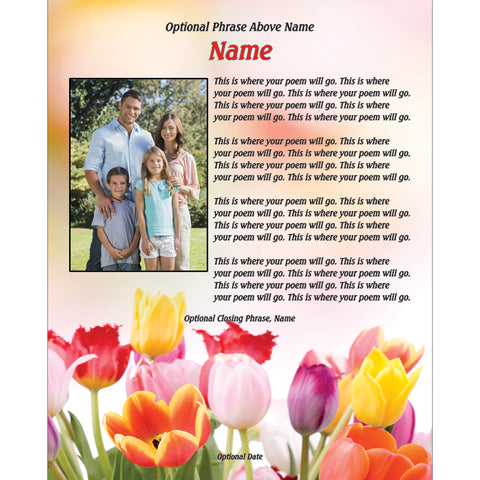Would you like to give the gift of your poetry to a friend or family member for a special occasion happening in their life? Your original poem or message with this uplifting and colorful tulip background would make a perfect gift for someone you care about. This personalized print can be framed in a standard 8x10 inch picture frame after delivery.